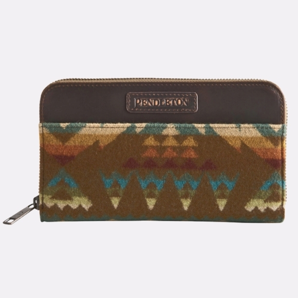 "Continental Zip Wallet" in "Solstice Canyon" made from Pendleton Wool with genuine leather trim. It features a sturdy brass zipper, an inner zip pocket, 8 card slots and two open pockets inside. It also has two outer pockets.