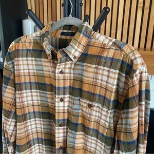 Mens Pendleton Wayne long sleeve corduroy button up shirt. Features a beautiful tan and blue plaid pattern and a chest pocket. Button enclosure. 100% cotton.