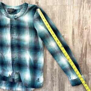 Pendleton women’s pajama top in blue and black plaid. Made from 100% soft cotton for comfort and breathability. Button-down style, size small. Cozy and classic design, perfect for lounging or sleepwear.
