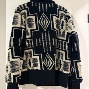 A cozy jacket, knit from soft plush fleece from Pendleton. Pair this vibrant print with a variety of cool weather looks for an easy unhurried finish.