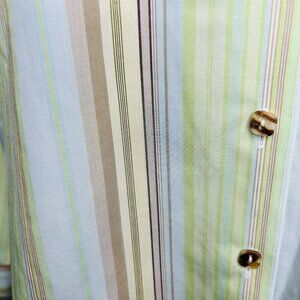 Pendleton Women's Sz 10P Petite Button Up Shirt Non-Iron Shaped Fit Multicolor, 100% cotton. This shirt is in excellent condition. It is a mix of green, yellow, light blue, tan, and brown stripes.