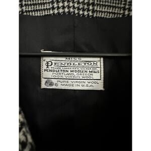Elevate your formal wardrobe with this Pendleton Women's Overcoat, a timeless piece crafted from 100% virgin wool. The classic black houndstooth pattern adds a touch of sophistication, making it perfect for formal occasions, business meetings, or elegant evenings out. The button closure ensures a tailored fit, while the medium size offers comfort and style. Made in the USA, this vintage overcoat is a must-have for any discerning individual. This item is pre-owned and requires dry cleaning for optimal care. Comes from a smoke-free household. Only serious offers, please.