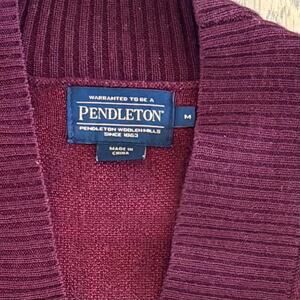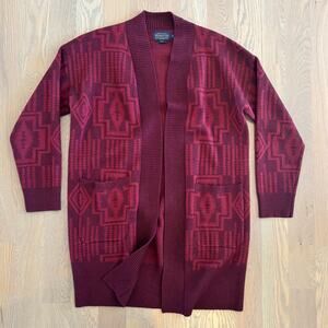 Pendleton Wool Blend Long Cardigan Open Front Southwest Aztec Womens Medium. Acrylic-wool blend. Heavy, thick, warm and cozy. Maroon/wine color. Double front pockets. Fits loose and relaxed, slightly oversized. Hits mid-thigh (5'7"). Excellent condition - minor pilling. Smoke free home. NEXT DAY SHIPPING.