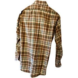 Vintage Pendleton Wool Board Shirt in brown/blue/tan plaid. Men’s Medium. 100% virgin wool, made in the USA. Classic double-pocket style with the 60s–70s blue/gold label. Very good vintage condition with no holes or major wear. Clean and ready to wear.
