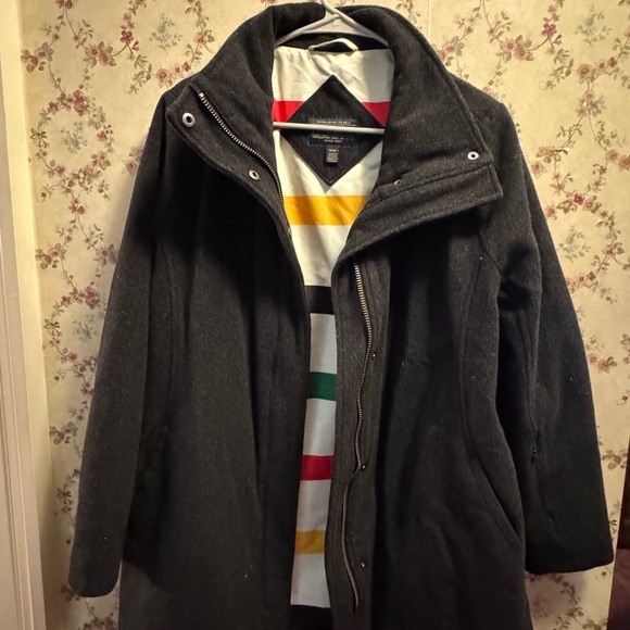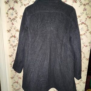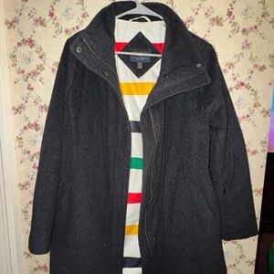 Features a sleek design. Ideal for layering. Wool coat, never been used. Striped lining