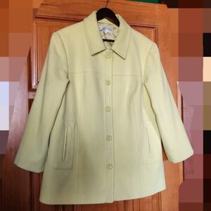 Pendleton wool peacoat in light greenish-yellow. There are a couple of nicks in the wool that aren't noticeable when worn, but they are visible when inspecting. There is a divot in the back from hanging on a coat tree that may come out with dry cleaning. Button closure with quilted collar and pockets. Fully lined.