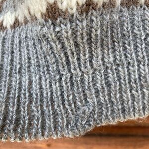 Wool V-neck sweater. See last photo for where a hole was mended on the bottom of the front. Otherwise in great shape. Listed as a small due to the measurements (tag says medium).