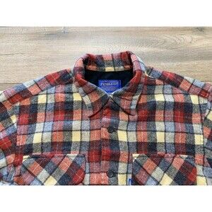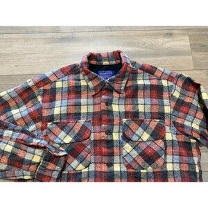 The Pendleton X Vans Authentic Board Shirt is a stylish and versatile addition to any man's wardrobe. Made from 100% virgin wool in a vibrant red, yellow, and black plaid, this button-up shirt features a collared neckline and long sleeves for a classic look. Ideal for casual wear, travel, or work, this shirt is breathable and suitable for all seasons. With a regular fit and size M, this Pendleton Board Shirt combines quality, style, and comfort for a timeless piece that is sure to make a statement. PLEASE OBSERVE MEASUREMENTS WITH USED CLOTHING TO VERIFY FIT.