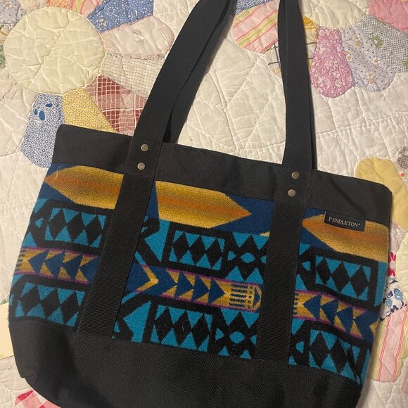Pendleton bag with interior pockets, wool and canvas, great condition, black, turquoise and mustard Southwest pattern.