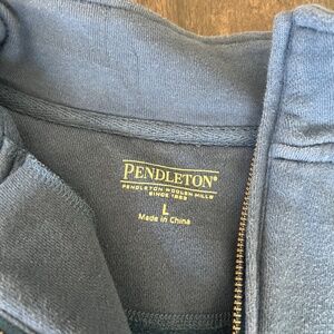 Worn but still in good shape. No visible flaws or stains. Color is a medium blue. Size large