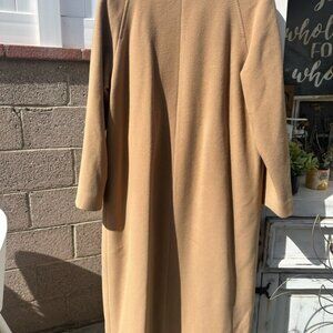 Stylish long tan coat featuring elegant gold buttons. Perfect for a chic look.