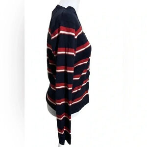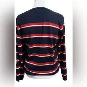 Navy blue, red, and white horizontal striped button up cardigan by Pendleton, size small. Silk / nylon blend. Overall great condition.