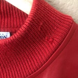 Ribbed on the arms and back with a leather front body. Zipper closure. Side slit pockets. A pull that was mended at the neckline area. Please review photos