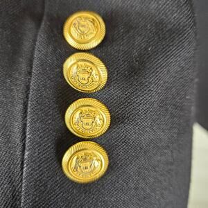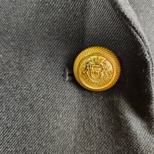 Double breasted with gold toned buttons and an interior button to secure. Hip pockets are still stitched closed. Four gold buttons on each sleeve. No back flaps. Fully lined interior, 100% virgin wool. Made in El Salvador. Great vintage condition! Dress up or down. Perfect for the office!
