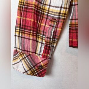 Wrap yourself in the cozy comfort of Pendleton's flannel button-down shirt, a timeless piece for your wardrobe. Designed with a classic plaid pattern in a harmonious blend of pink, yellow, and brown, this shirt brings a touch of outdoor warmth to any setting. Tailored for the petite frame, it's a versatile fit that suits casual outings, travel, or even a cocktail party.