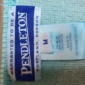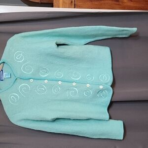 Pendleton wool blend embroidered sweater. Light aqua. Button up. Pre-owned, slight discoloration on left shoulder, see pic. Overall beautiful condition. Size M(armpit to armpit approximately 18 inches. Length approximately 21 inches) (1828)