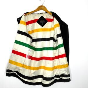 Pendleton wool coat blanket striped lining. Wool blend, zipper and snap front closure. Blanket striped lining. Front pockets, zip pocket on sleeve. Faint discoloration on lining by neck.