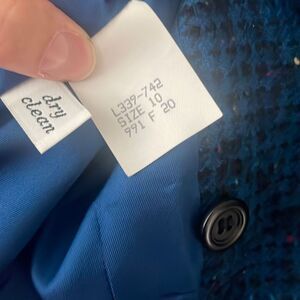 Additional Details: Button front, fully lined, single button accents on cuffs, faux front pockets, spare button inside edge of placket, boucle textural plaid with black/multicolored threads throughout.