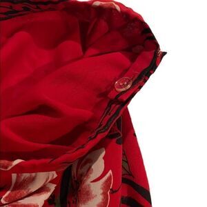 Red skirt with a pretty floral pattern. Lined with a tulip hemline. Leftside zip, hook/bar, and button closure. Darts in front and back.