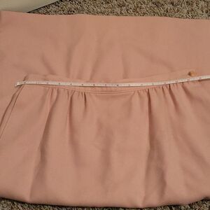 Beautiful Pendelton Wool skirt in a soft, dusty pink color. There is a small stain on the front. There seems to be a pocket under the button, but it is a weird pocket because it opens into the inside of the skirt.