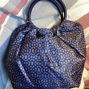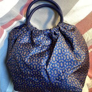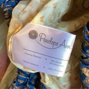Stylish oversized Penelope Ann shoulder bag or tote bag. Blue with brown accent pattern. Braided faux leather handle with 7 inch double loop. Open top with no closure. Round bag about 16 inches in diameter. Nylon/ polyester exterior. Interior is 100% polyester. It is a cream color with an almost gold pattern of butterflies, PA and flowers. There is one side zipper pocket, two open pockets and key fob attached to the side. Bag is new without tags. Never used. Great bag.