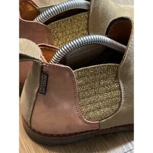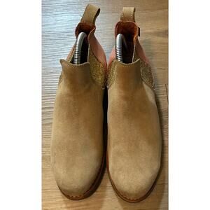 The Penelope Chilvers Safari Metallic Patchwork Ankle Chelsea Boots in size 40EU is a stylish and unique pair of women's shoes. Made of suede with a metallic patchwork design, these boots feature a gray color and a classic Chelsea style. The ankle shaft adds a modern touch to the traditional boot silhouette, making them a versatile and fashionable choice for any outfit. While these boots are a size 40, I usually wear a size 9.5-10US, and they fit me perfectly.