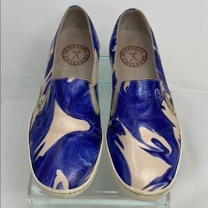 This is a wonderful pair of Penelope Chilvers Sz 39 Leather Slip On Sneakers beautiful blue and off white marbled leather design. Elastic vamps on each side. Very comfortable and pretty. No issues. Normal wear. No odors. No tears. No stains.