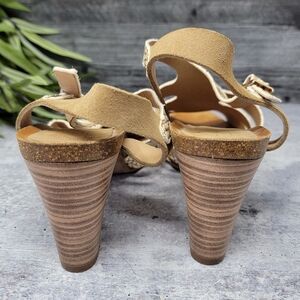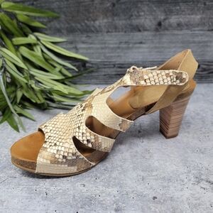 Fun & sexy snakeskin print heeled sandals in shades of cream, tan, & brown.
