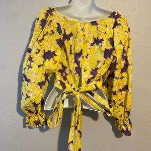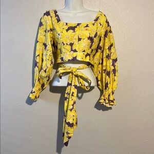 The perfect set for spring, Featuring a custom print that will leave you being the best dressed where ever you go. With stunning balloon sleeves and a tie up back for adjustable wear. Cropped top Yellow and purple colourway Straight neckline Balloon sleeve Elasticated sleeves Button...