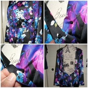 New with tag, absolutely gorgeous satiny romper from Penelope Tree. Black /multi floral pattern. Stunning blues and purples! Surplice front neckline with snap closure. Zips up the back. Pockets. Size XS. Long sleeves that can be adjusted to be 3/4. Elastic waist with ties to cinch waist. Honestly would love to keep it but it's too small for me now. Approximately 30 inches long and 18 inches across laying flat. Measurements in the photos.