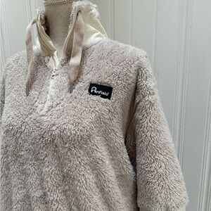 Cozy sherpa jacket by Penfield. Features a half-zip front. Soft and warm material. Perfect for layering.