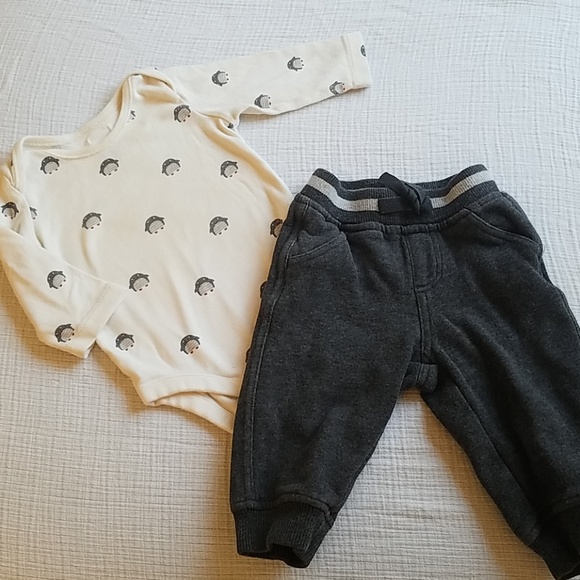 Adorabe BabyGap penguin onesie. Cream with grey penguins. No stains. Gymboree grey sweatpants with actual pockets. So cute and so cozy! These just look so cute together I had to bundle!