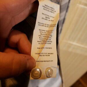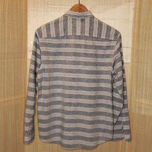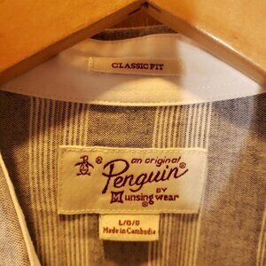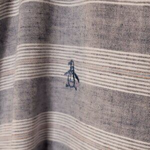Penguin Men’s grey white Classic Fit linen blend striped long sleeve button down large. Good condition. Measurements are: 25” sleeve, 25 ½” from shoulder to hem, and 23 ½" from armpit to armpit.
