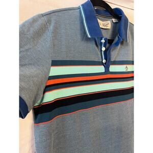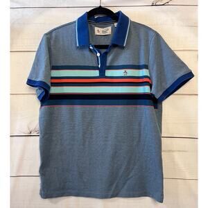 This Penguin Men's Polo Top in Size Large features a stylish striped pattern, short sleeves, a collared neckline, and a button closure. Made of comfortable cotton knit fabric with a medium wash, this casual polo is perfect for everyday wear. The blue color adds a pop of color to your wardrobe, and the logo accents add a touch of branding. Easy to care for with machine washable instructions, this polo is ideal for summer and spring seasons, and can even be worn for a round of golf.
