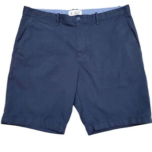 These Penguin men's shorts in size 36 feature a solid blue color with a zip closure and a flat front design. Made of cotton knit fabric, they have a 10-inch inseam and a mid-rise waist. Ideal for travel or casual wear, they have slash pockets and are machine washable. With a Bermuda style and American theme, these shorts are suitable for summer, fall, and spring seasons.