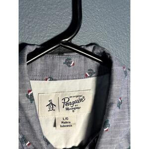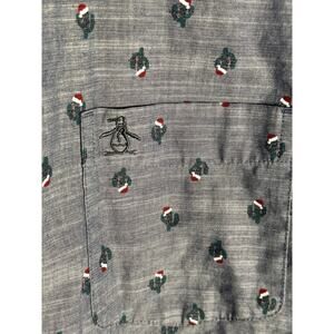 This Penguin MunsingWear Men's Bluish/Gray Button Down Shirt is a classic addition to any wardrobe. With its button-down collar and short sleeves, it's perfect for a casual day out. The shirt is made of a blend of polyester and cotton, providing both comfort and durability. The fabric type is cotton, making it easy to care for and maintain. The shirt is a size large and has a regular fit. The color is bluish/gray, adding a touch of sophistication to any outfit. The closure is a simple button, making it easy to put on and take off. The shirt can be worn for many occasions, including work or a night out. It's a timeless piece that will never go out of style. shirt has multiple cactus with santa hat on which is unique.