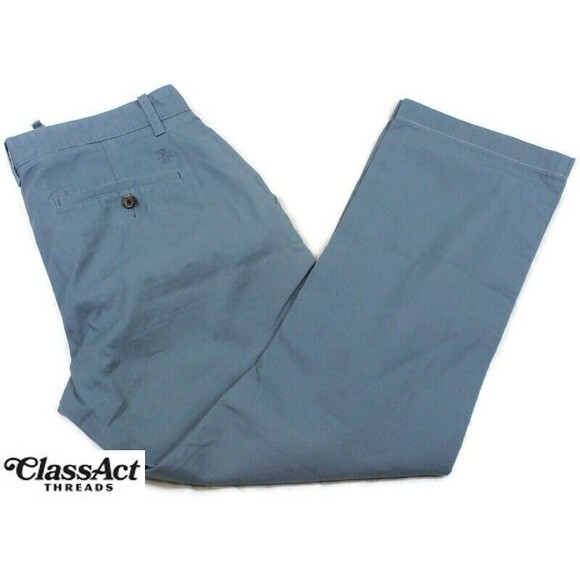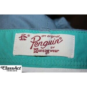 These Penguin pants are crafted from blue cotton in a Chino style with a flat front design. They feature a mid-rise waist and a straight leg with a 28-inch inseam, suitable for travel or casual occasions. The pants have a size tag of 32x34 but actually measure 32 inches at the waist. With a zipper closure, slash pockets, and a solid pattern, they offer comfort and easy care, making them ideal for various seasons and settings with a college, city, or preppy theme.