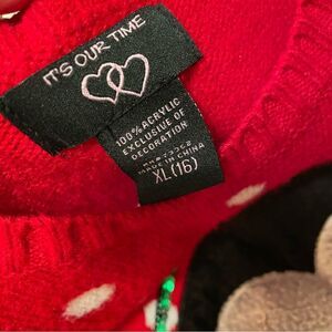 Penguin Plush Appliqué Crewneck Girl’s Red Christmas Sweater, White Polk…