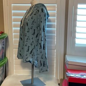 Stay cozy and stylish with this penguin print blue hoodie. Perfect for casual outings.