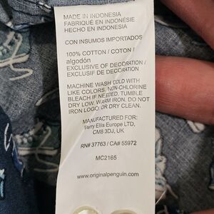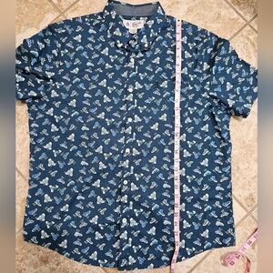 Playful and stylish, this Penguin men’s XL button down shirt features an allover blue sneaker graphic print on a rich navy background. Lightweight cotton blend with a casual camp vibe — perfect for summer outings or adding a fun twist to your wardrobe. Great Y2K-style throwback piece!