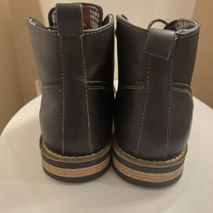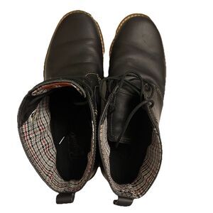 Preowned / Like New: Penguin by Munsingwear Chukka Boots in black leather, size 11.5 for men. These lace-up boots feature a round toe, distressed accents, and an embossed penguin logo on the heel. They offer arch support, cushioning, and a lightweight rubber outsole. Ideal for travel, parties, or casual wear, these stylish boots with a wood & rubber stacked heel are perfect for any season.