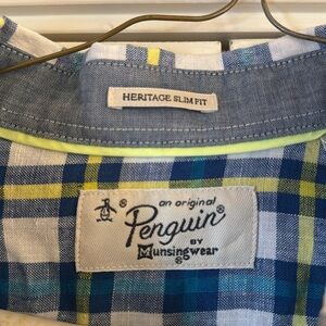 Penguin, casual linen short sleeve button up shirt. Looks great with shorts or jeans. Perfect for the office, date night, or just browsing around town. Shirt is in great condition with no known imperfections. See photos for details and measurements. From a non-smoking home.