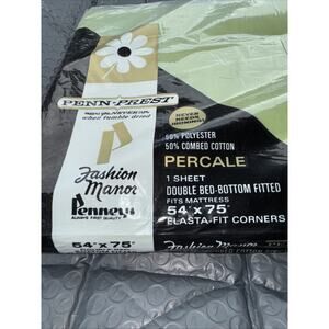 This vintage Penn Prest Percale double size fitted sheet in moss green is a classic addition to any bedroom. Made in the United States, this solid color sheet is perfect for adults, teens, and kids alike. With its original design and percale material, this fitted sheet is not only stylish but also machine washable for easy care. Measuring 54 x 75 inches, this rectangular sheet includes a flat sheet and is ideal for collectors of vintage linens or anyone looking to add a touch of retro charm to their space.y be
