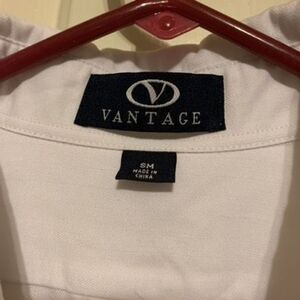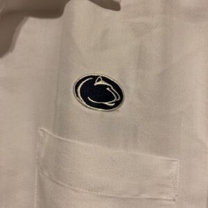 Penn State Size Small White Long Sleeved Button Shirt. 60% polynosic rayon/40% polyester. 22” armpit to armpit, 30” long.