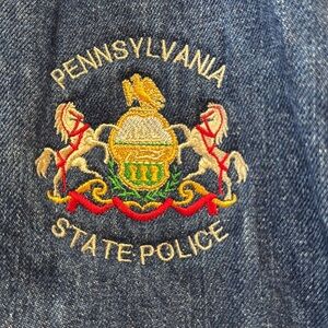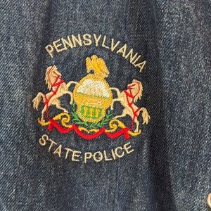 Pennsylvania State police size large jean jacket. This jacket is so vintage and would be a perfect gift for the retired state cop in your family. Jacket is in great condition. The buttons are so cool.