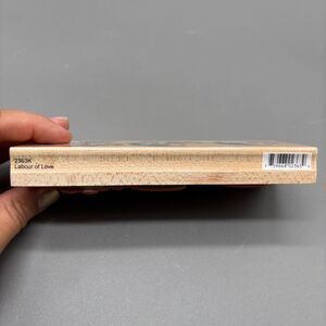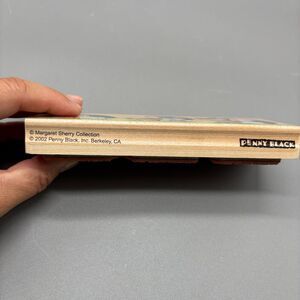 Vintage 2002 Penny Black wood mounted rubber stamp from the Margaret Sherry Collection, design name Labour of Love (#2363K). Features her signature hedgehog characters gardening and presenting a bouquet of roses with a For You tag. The stamp measures approximately 6 inches long by 2.25 inches tall. It is in unused condition with no noticeable issues. See photos for measurements and condition details.