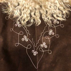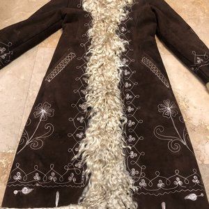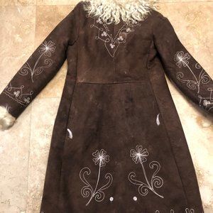 Vintage 70s Penny Lane Coat - Dark Brown Afghan Sheepskin Coat with the most beautiful Floral Embroidered/Stitched Design & Shaggy Black Fur Trim