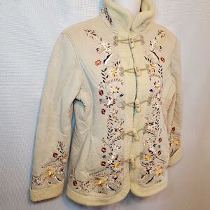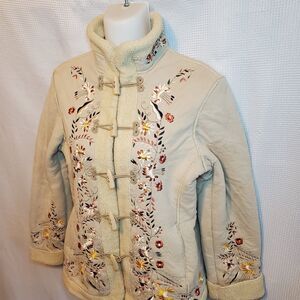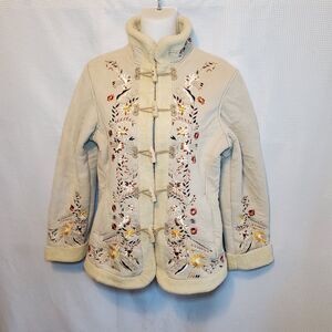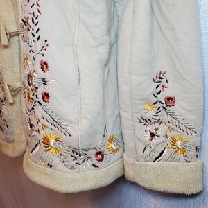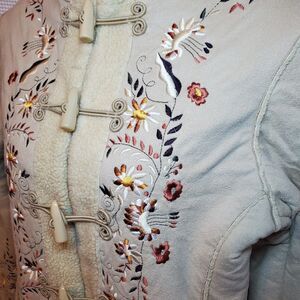 Penny Lane Tan Faux Suede Leather Embroidered Coat SHERPA Sz S Pheobe Friends