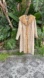 this beautiful piece is a pale ivory tan. It is vegan suede that has been patchwork to give it a more vintage. Look his info for trim around the collar front sleeves and peaks out from the hand and it is fully lined with fur. Hook and I large closings in excellent condition.