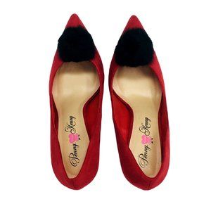 Penny Loves Kenny Manner Pointed Toe Pumps Red suede body. Black fur pom pom embellishment. Classic silhouette. Ultra femme. All vegan textile upper. Cushioned insole. Synthetic sole. Covered stiletto heel appx 4.25". Extra tips included. Ships in original box with extra protection covering toe, pom. Size 11W 11 Wide.